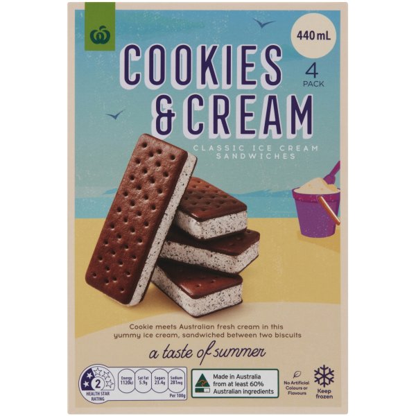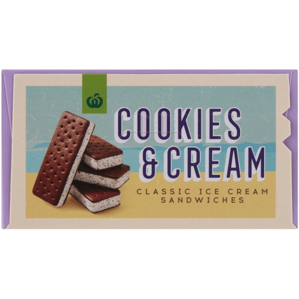 Browse our Ice-cream sandwich recipes. Woolworths Cookies Cream Ice Cream Sandwich 4 Pack Woolworths Cookies Cream Ice Cream Sandwich 4 Pack 2. For all liquor orders processed Woolworths Group is acting as an agent on behalf of Endeavour Group Limited ABN 77 159 767 843.
